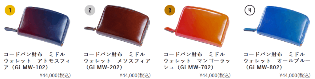 | 4 | コードバン財布 ミドルウォレット オールブルー(Gi MW-802) | ¥44,000 | – |